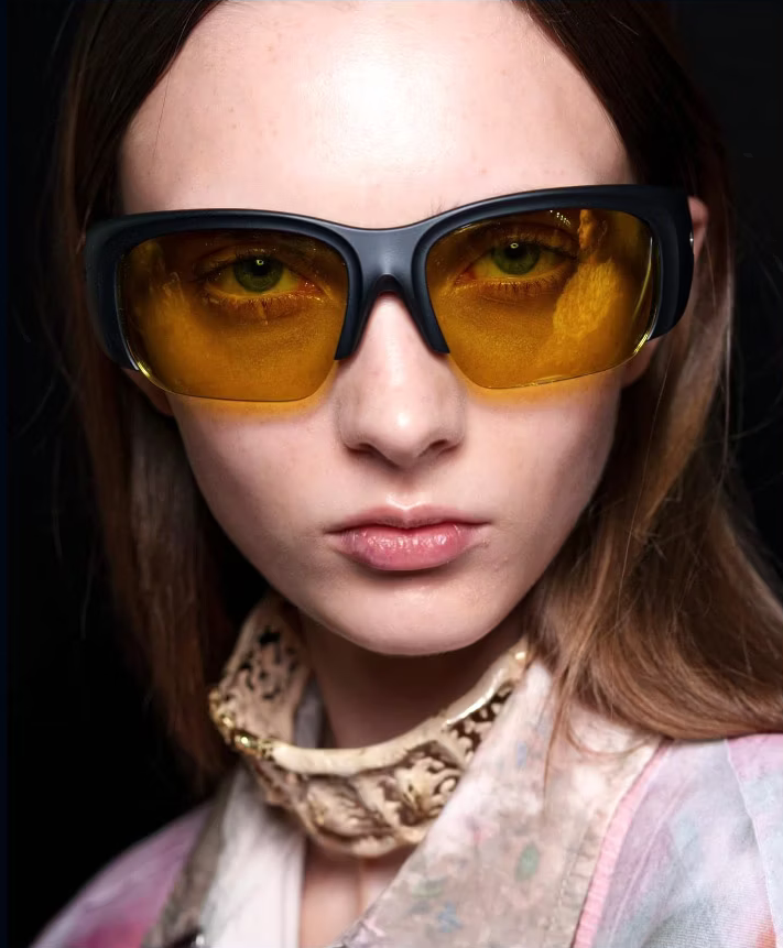 One of the most visible shifts this season is the rise of droopy curves—frames defined by soft, flowing silhouettes. Inspired by a broader movement toward organic design, these shapes feel relaxed yet futuristic. Downturned angles, references to 70s design, and fluid temples create a look that appears sculpted from every angle. This trend moves eyewear away from rigid geometry and into a world where form feels intuitive and elevated.